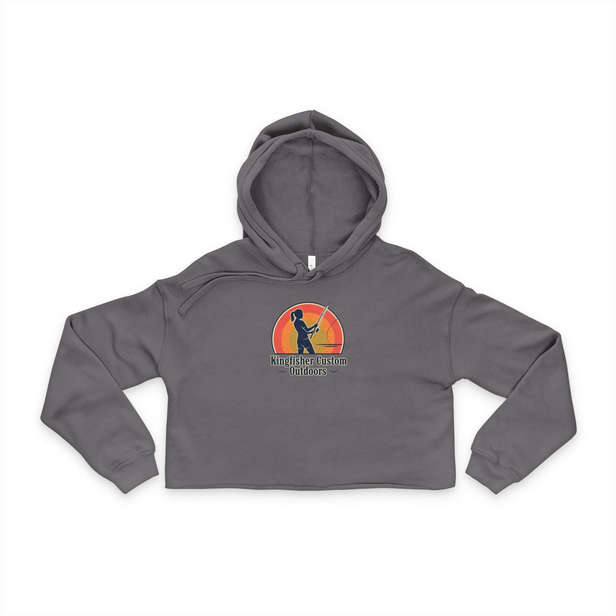 This cropped hoodie brings a relaxed, outdoorsy spirit to everyday wear. The muted charcoal canvas and vintage-inspired angler graphics speak quietly but confidently — a nod to women who fish, camp, and live for that calm moment by the water. The dropped shoulders and raw hem create an easy silhouette that layers over high-waist jeans or leggings, while the soft cotton-poly fleece keeps things warm without weight. Wear it to early-morning casts, bonfire nights, or slow weekend drives; it reads like a comfortable companion that shares your hobbies and stories.