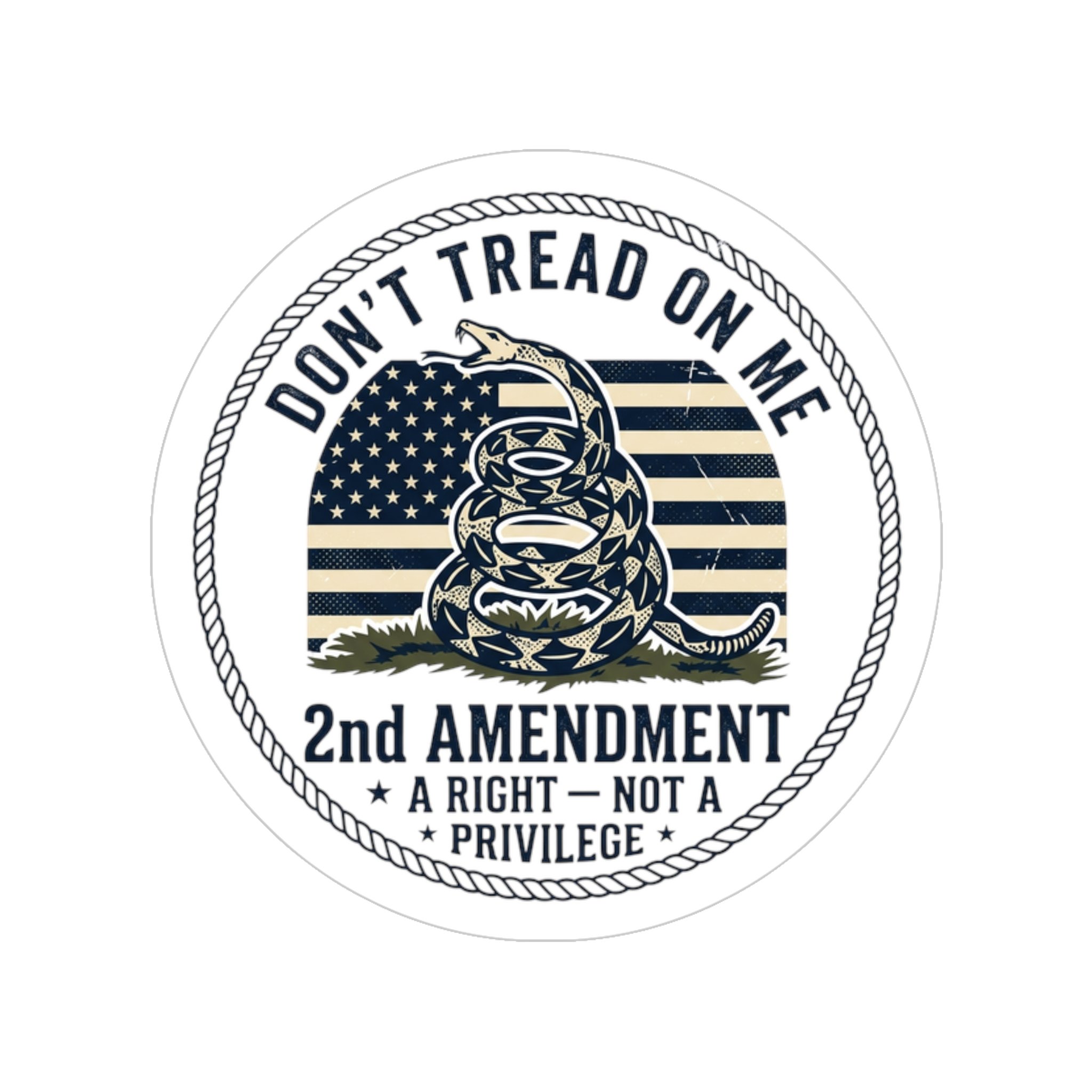 This round transparent outdoor sticker speaks with quiet confidence. A coiled rattlesnake sits before a worn flag motif, encircled by rope-edge detailing and bold text that champions the 2nd Amendment. Printed on water-resistant vinyl with a matte UV laminate, the graphic keeps rich, crisp tones while remaining weatherproof for years. It blends into metal, glass, or painted surfaces — small enough to be subtle, bold enough to make a statement. Stick it on your toolbox, cooler, vehicle, or gear when you want a durable emblem that reflects your beliefs and stands up to rain, sun, and rough use.