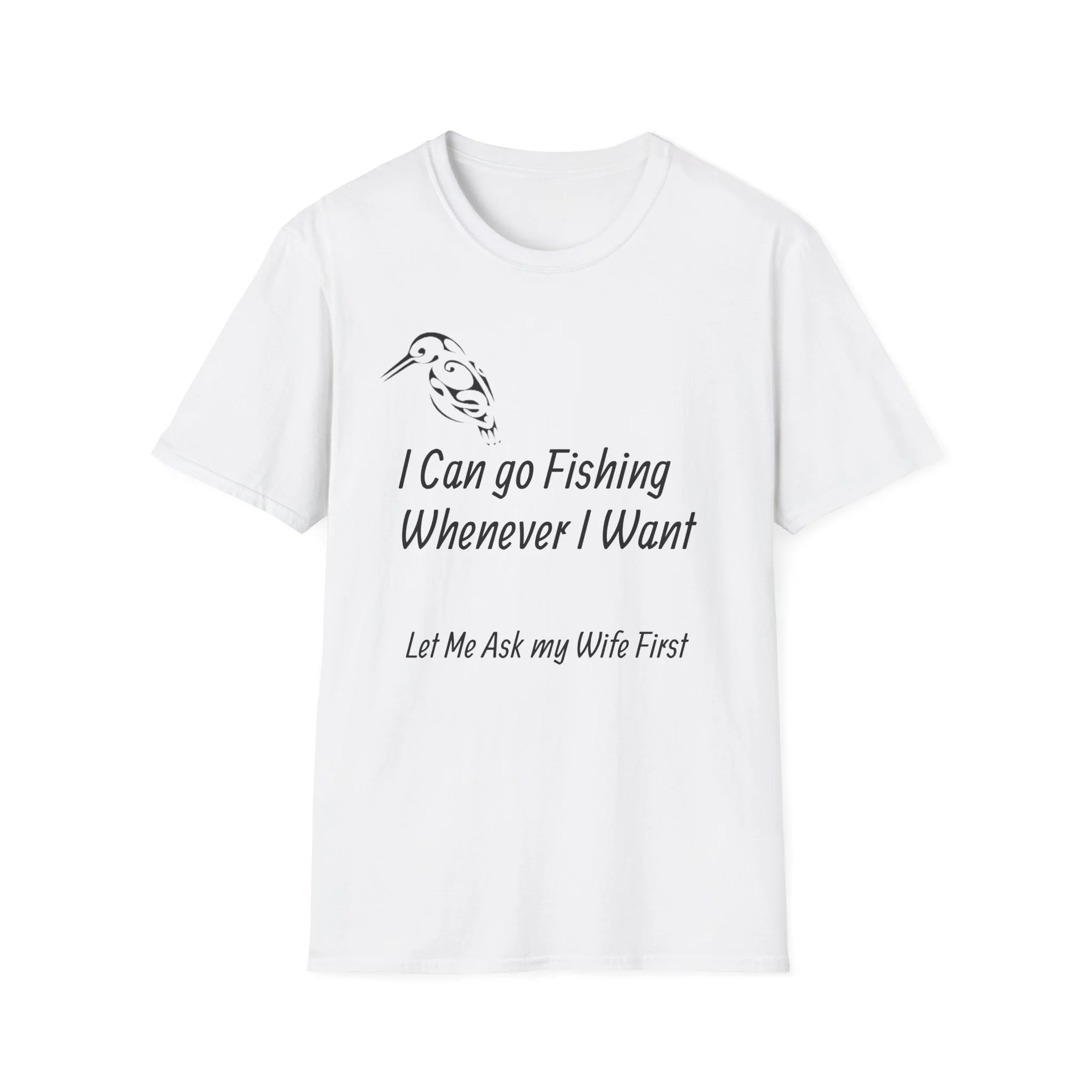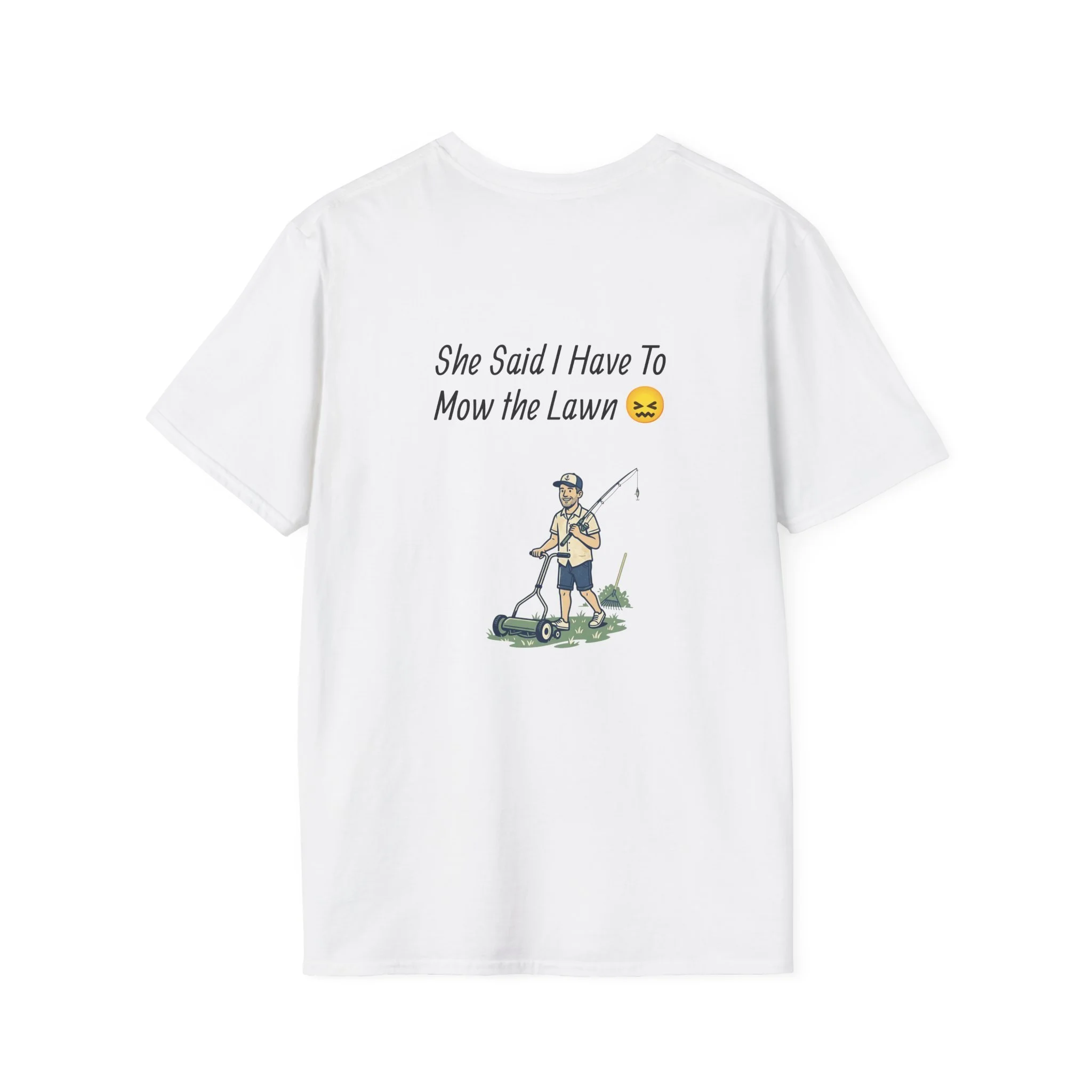 A lightweight, everyday tee that wears like a loyal friend—soft, breathable, and printed with a wry fishing-and-lawncare design that tells a small story. The front shows a simple fish sketch with the line “I Can go Fishing Whenever I Want” and the cheeky follow-up “Let Me Ask my Wife First.” The back continues the story with a cartoon-style angler pushing a mower under the line “She Said I Have To Mow the Lawn” with a playful emoji. The result is an easygoing shirt that slips into weekend routines, backyard barbecues, and early-morning trips to the bait shop. It’s made from ring-spun cotton with a classic crew neck and a clean, tubular knit that lays flat and resists twisting. Tear-away label and reinforced shoulder tape keep it comfortable and long-lasting. The prints use DTF/DTG methods for crisp detail that holds up to wear. Wear it to nudge a laugh, share a familiar domestic joke, or just relax in familiar surroundings.