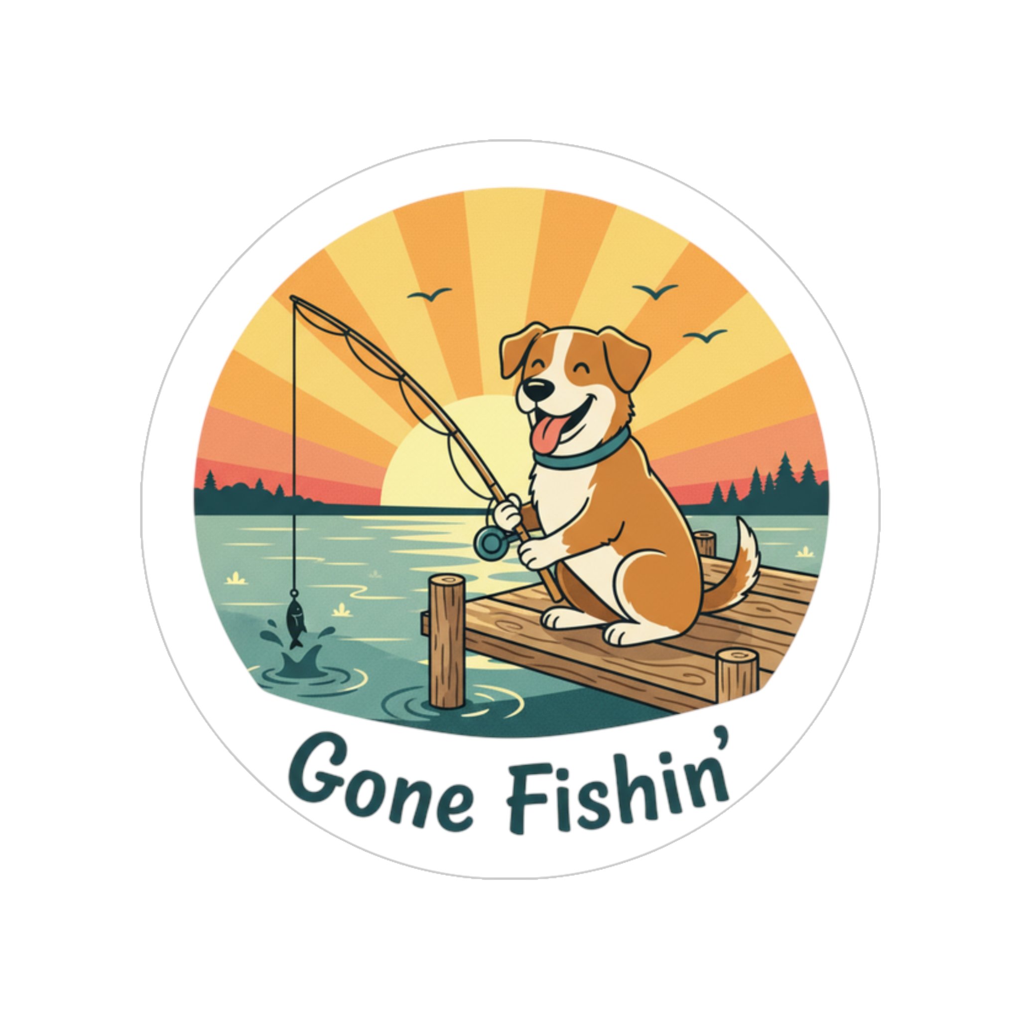 Gone Fishin' Dog Round Sticker — Outdoor Waterproof Vinyl
