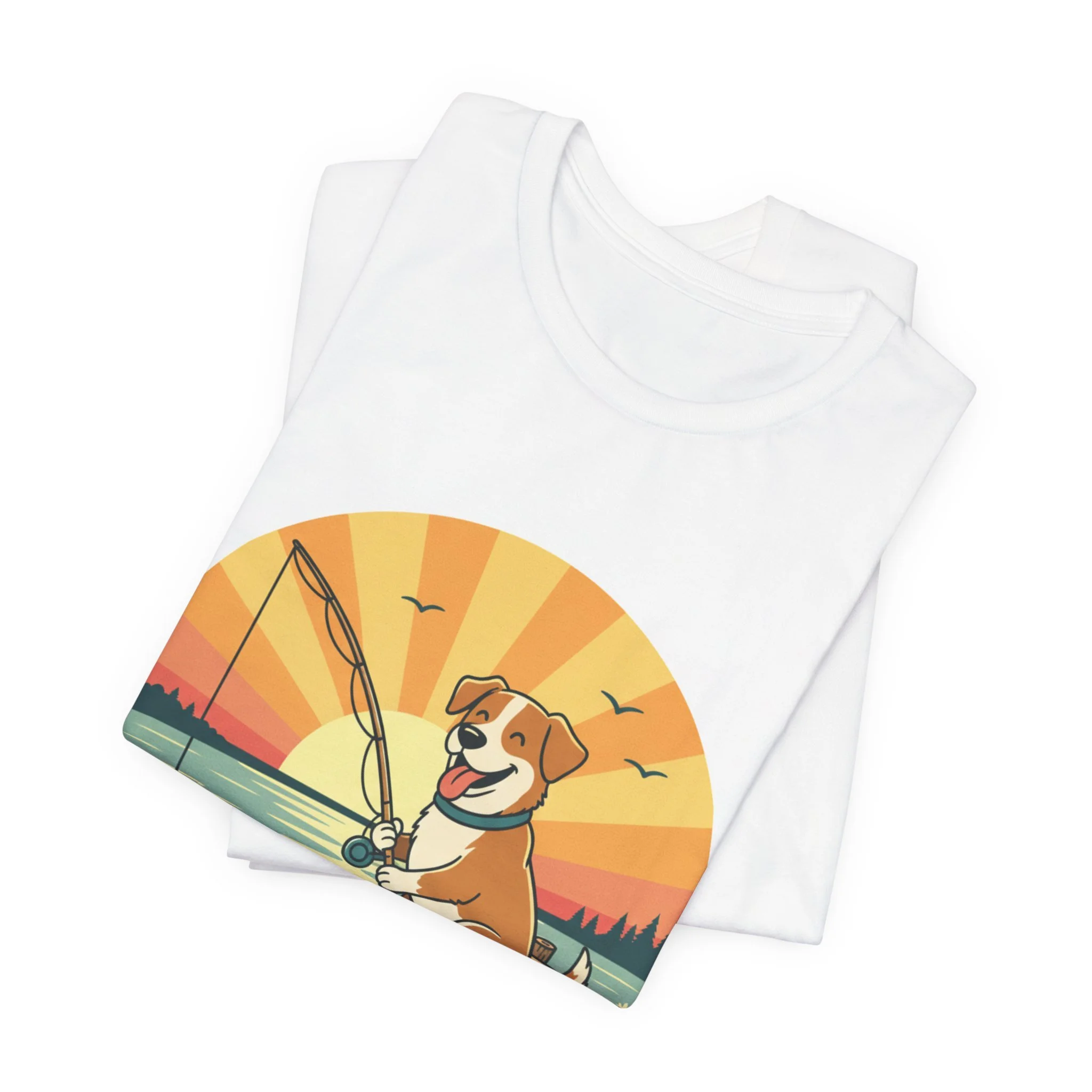 Lightweight, soft, and built for easy days by the water. This crew-neck tee pairs breathable Airlume combed cotton with a relaxed retail fit, showcasing a sunlit vintage-style illustration of a happy dog casting a line from a wooden dock. The front art carries warm sunset tones and playful movement; the back features a subtle scripted mark that reads like a local outdoors brand. Wear it on early-morning casts, lake trips, or backyard cookouts — it layers cleanly under jackets and stands up to repeated wear thanks to side seams, ribbed collar, and reinforced shoulder tape. Ethically produced and REACH certified, the shirt offers a tear-away label for comfort and dependable print detail from modern DTF/DTG finishing methods.