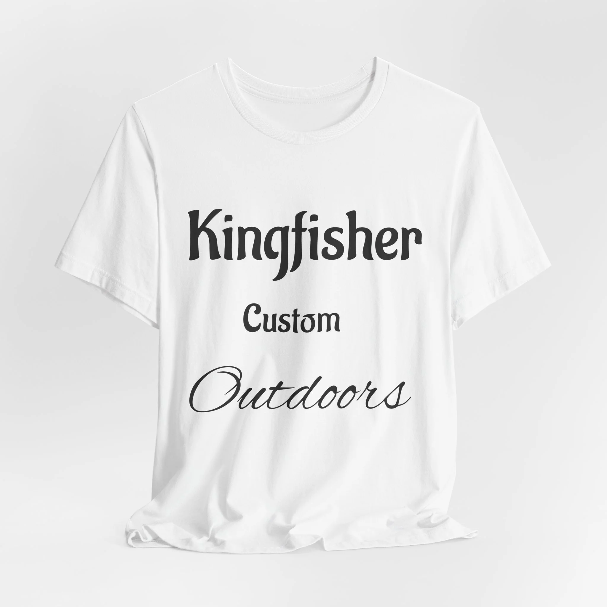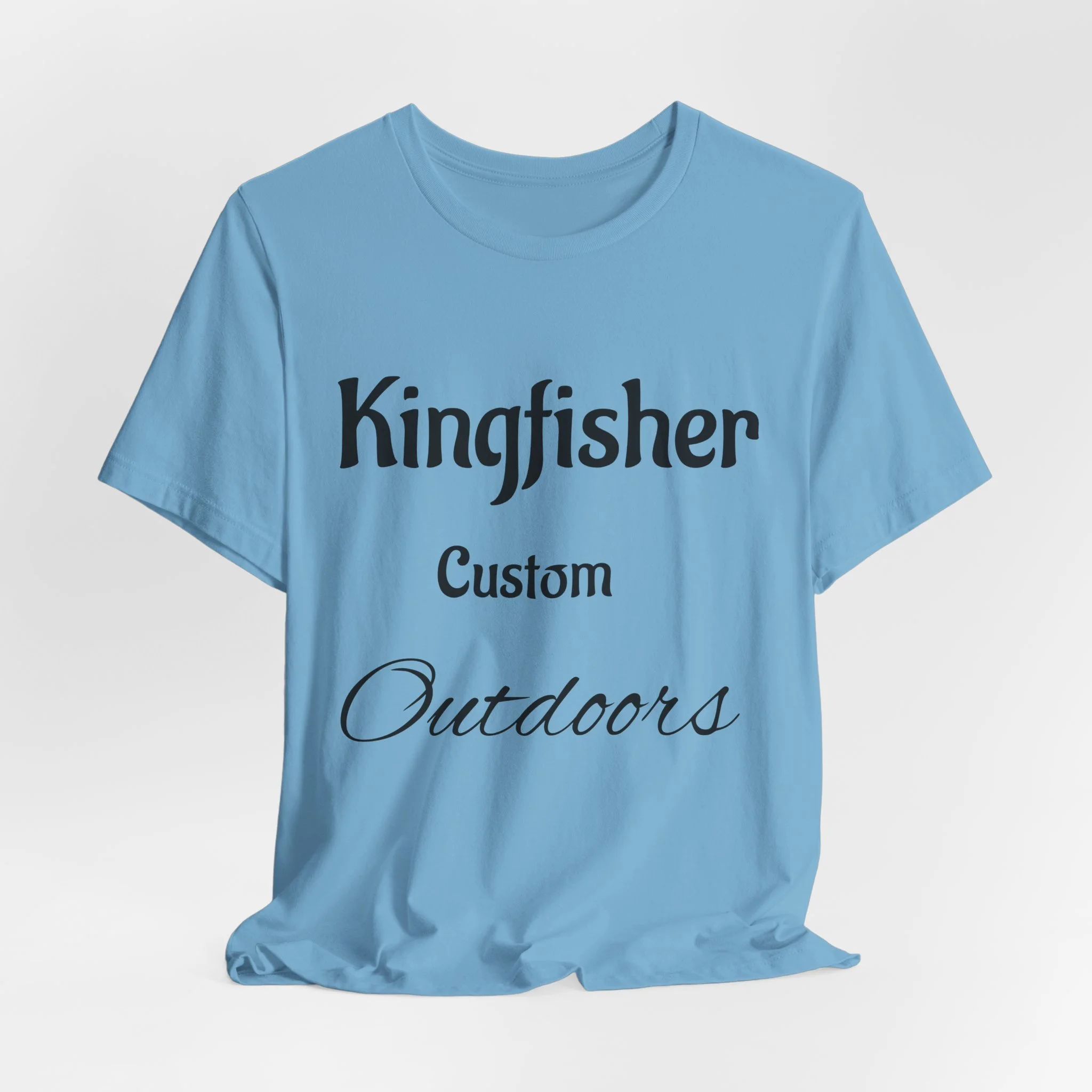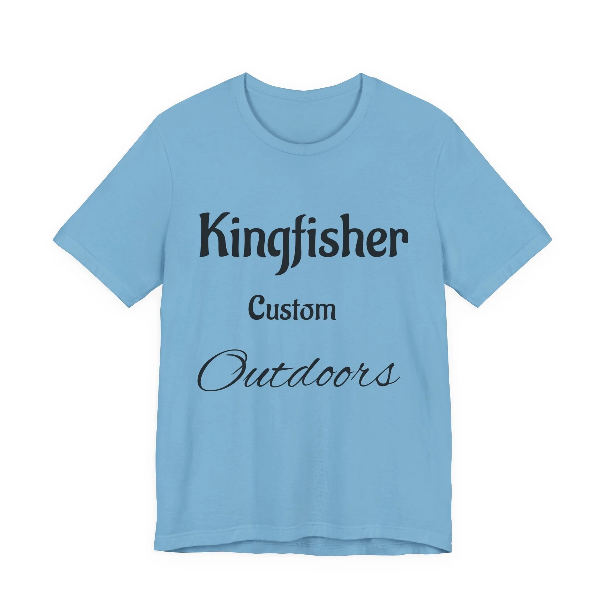 Kingfisher Outdoors T-Shirt — Tribal Kingfisher Graphic Tee (Front: "Kingfisher Custom Outdoors", Back: "Sunshine, Surf and Blue Waters")