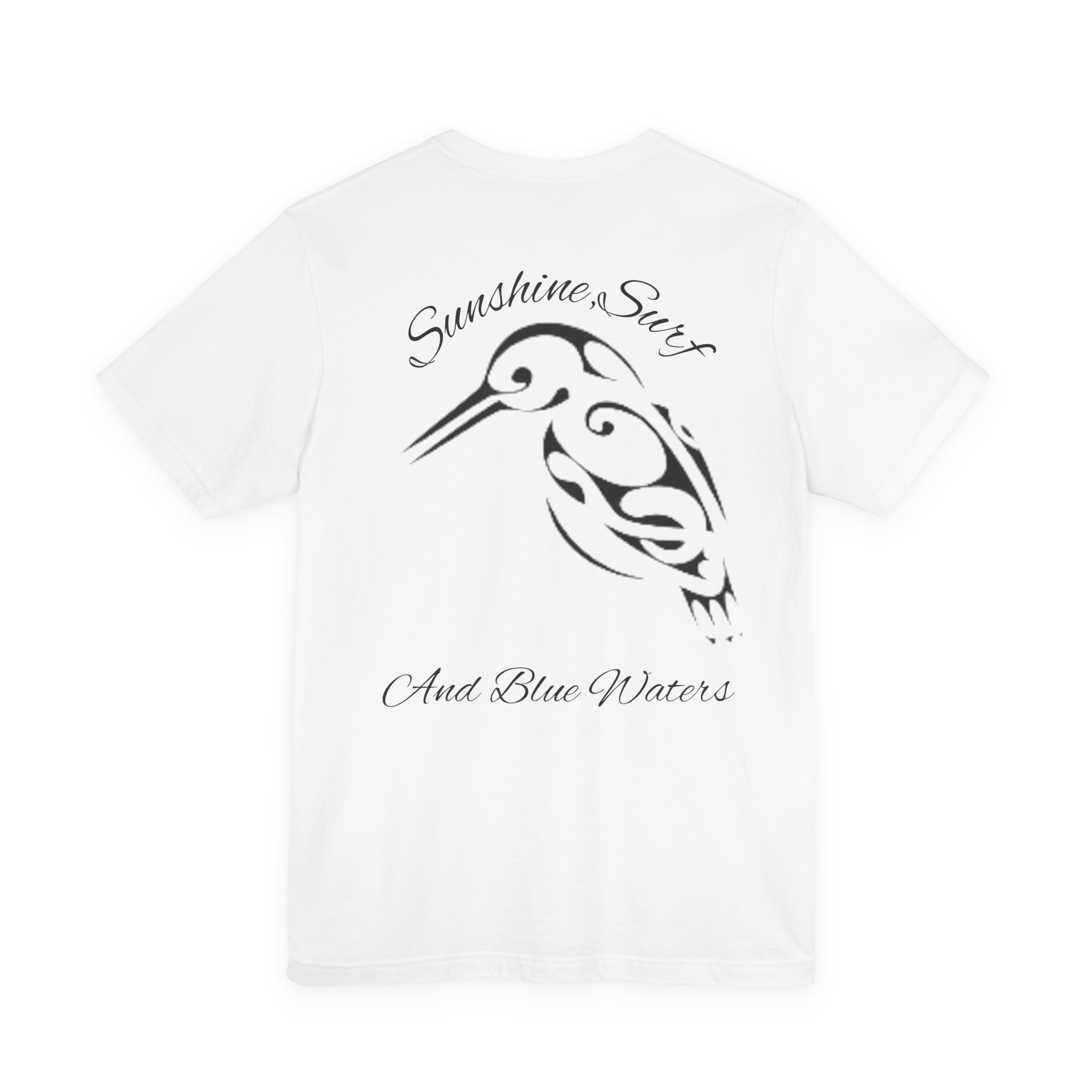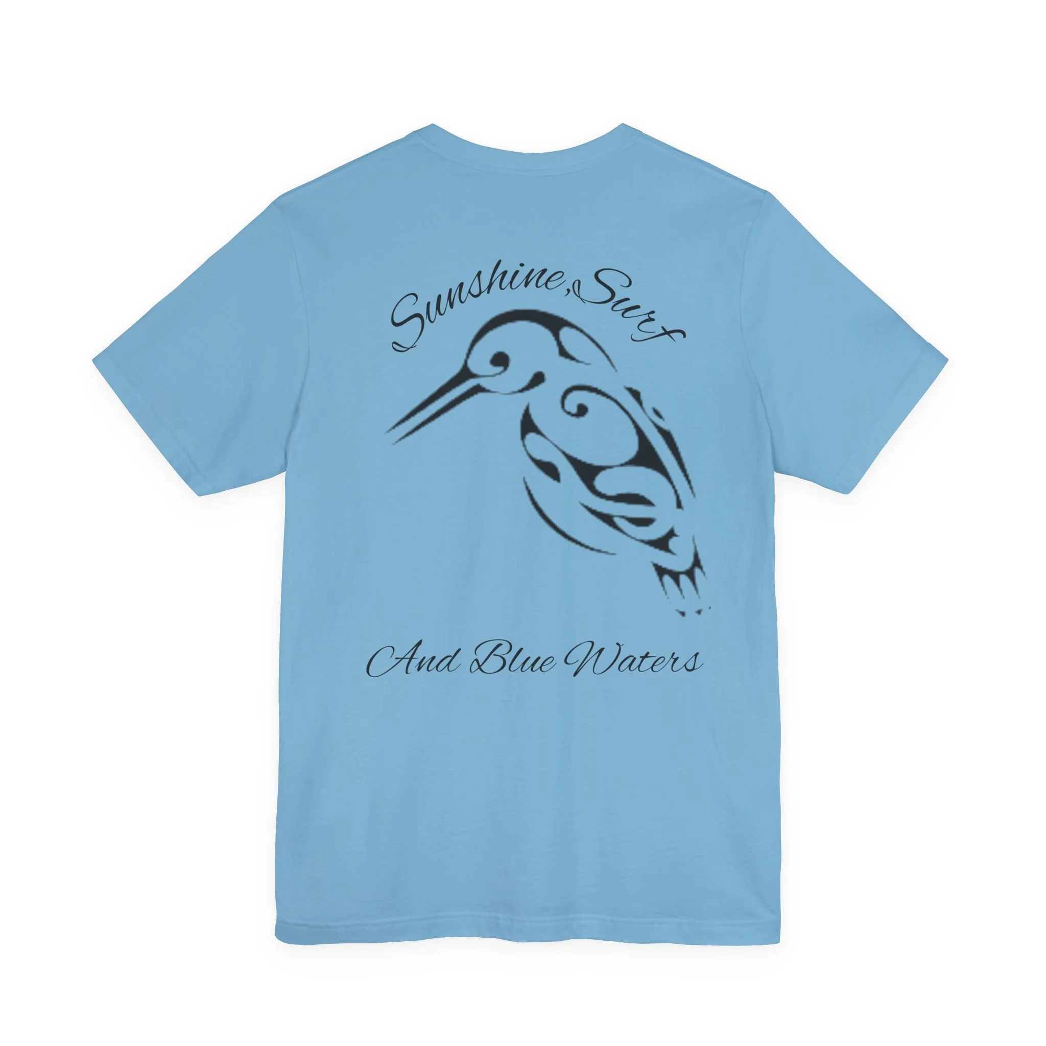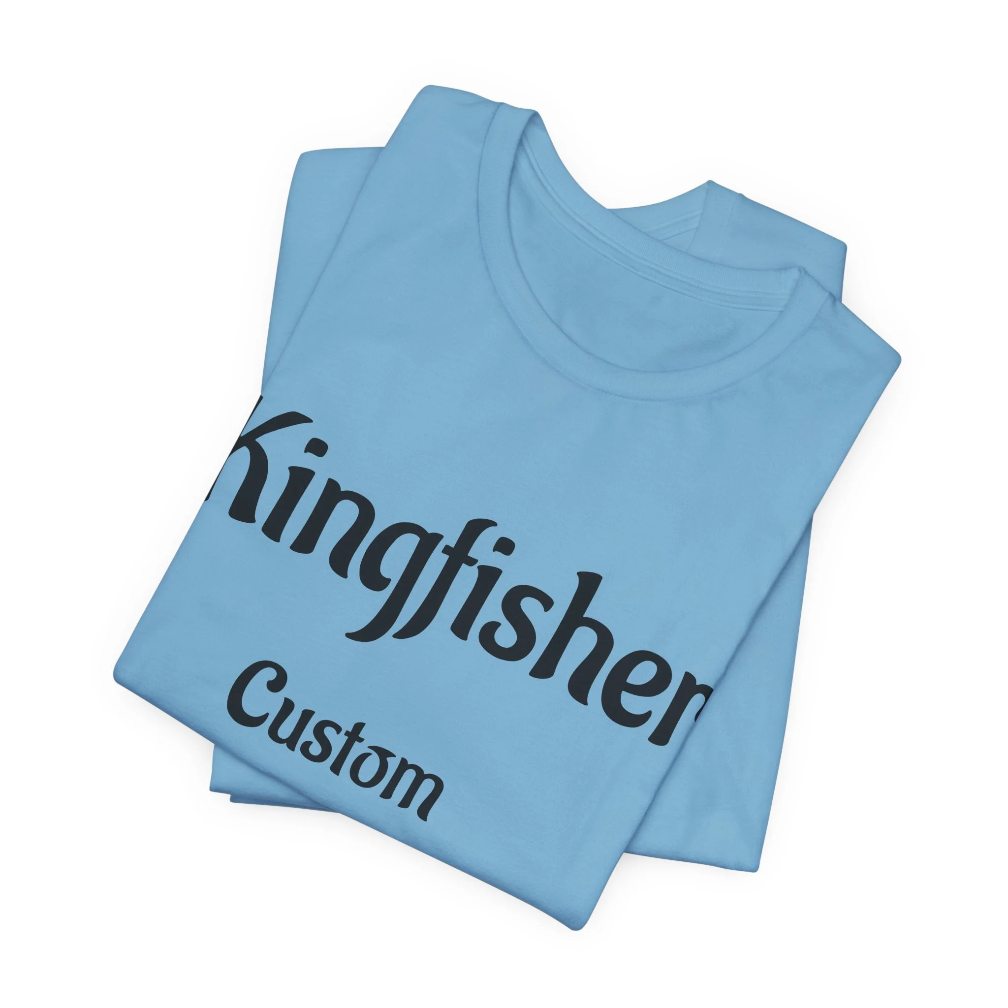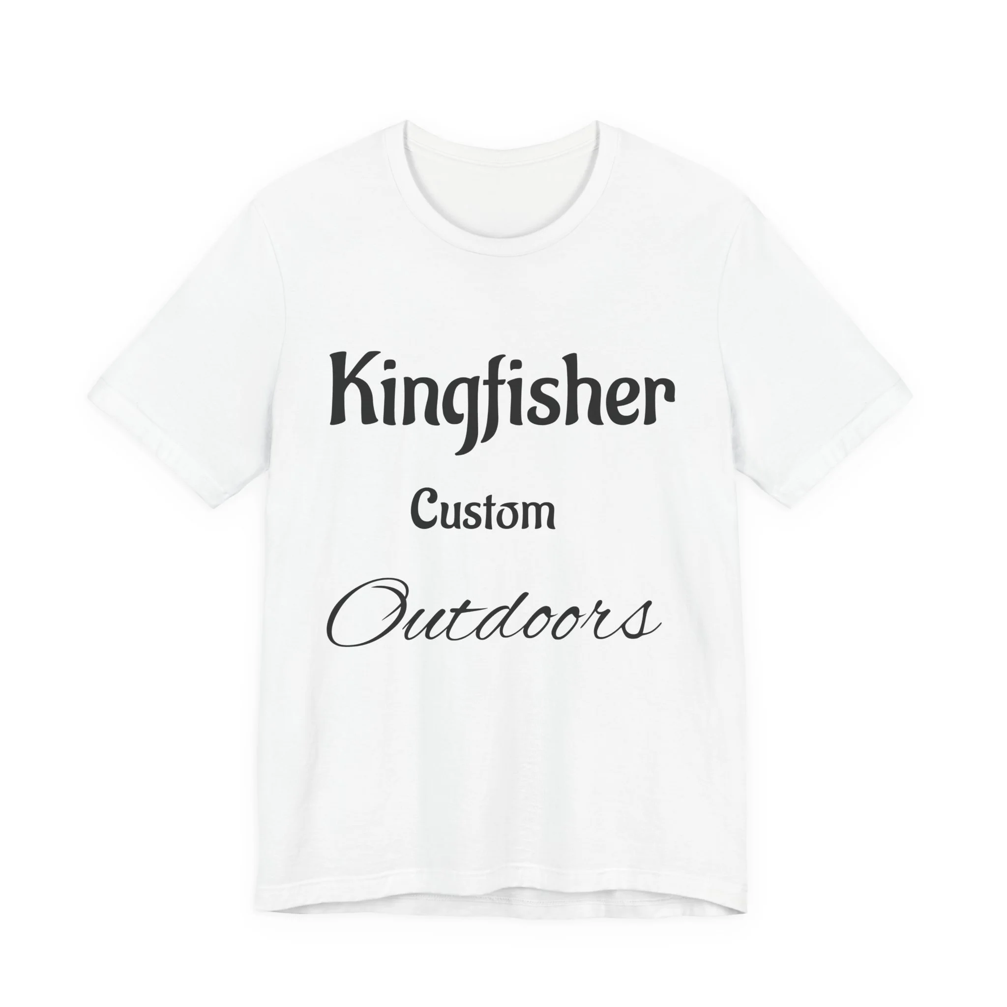 Kingfisher Outdoors T-Shirt — Tribal Kingfisher Graphic Tee (Front: "Kingfisher Custom Outdoors", Back: "Sunshine, Surf and Blue Waters")